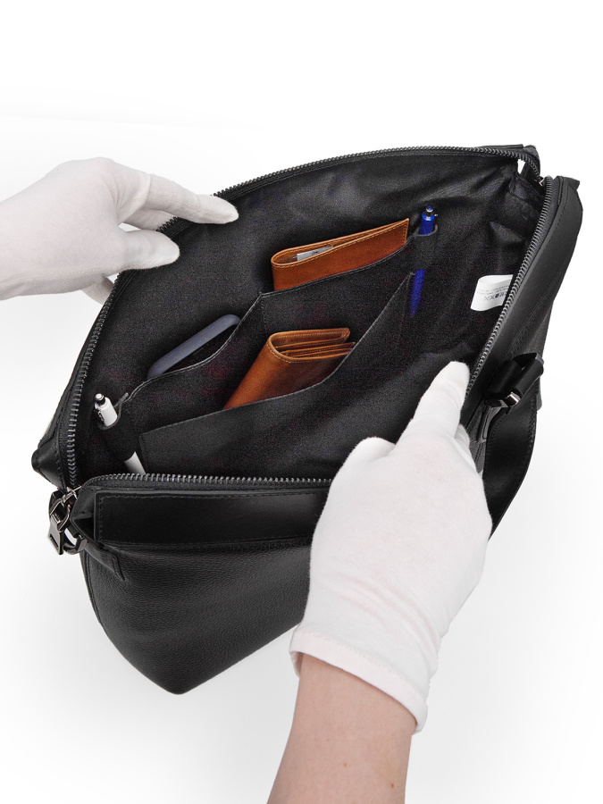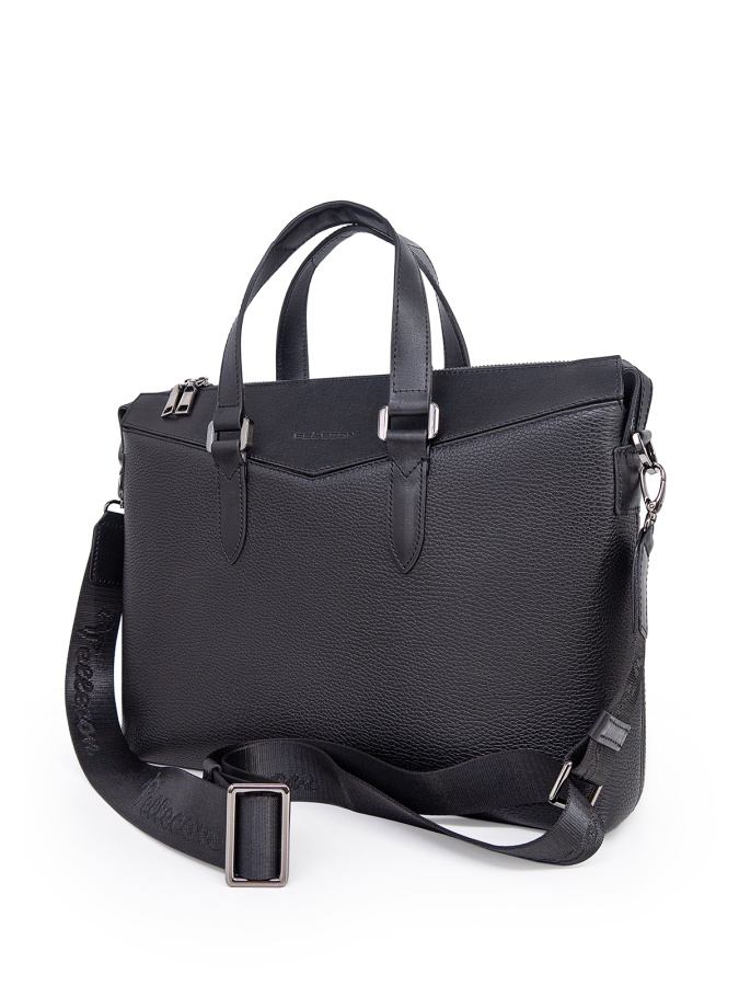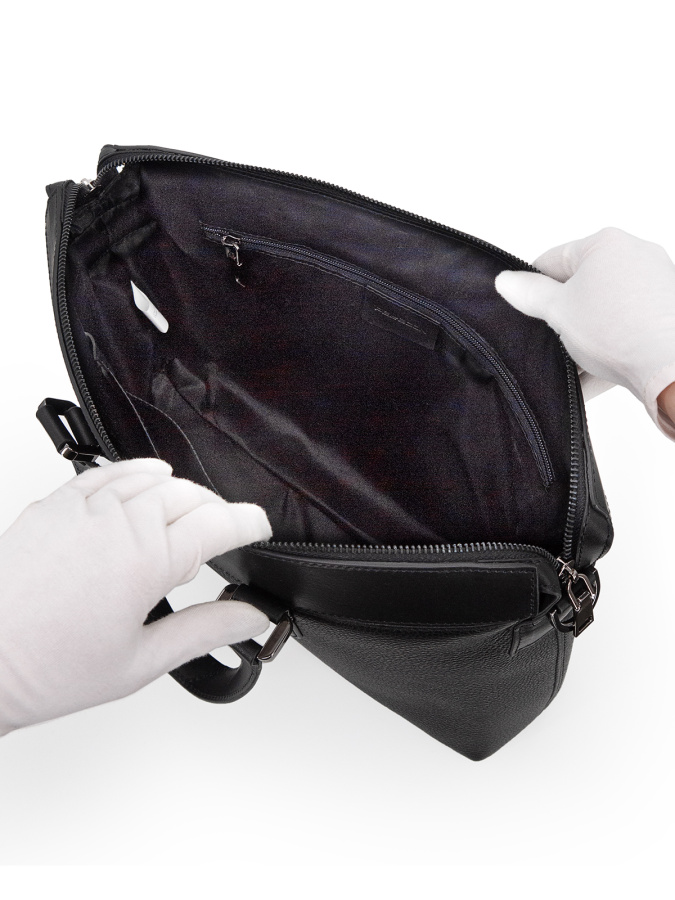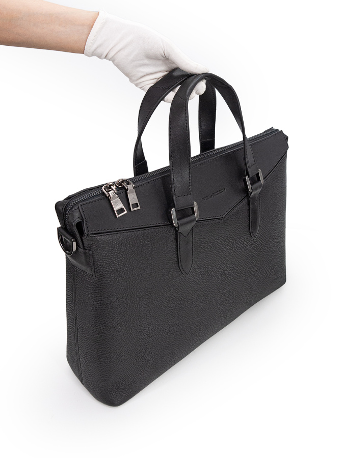 Натуральная кожа. Размер (ШхВхГ): 38х29х8 см Закрывается на "молнию". Внутри: одно большое отделение), карман на молнии общего назначения, три кармана открытого типа и шлевка для авторучки. В комплекте съемный плечевой ремень.