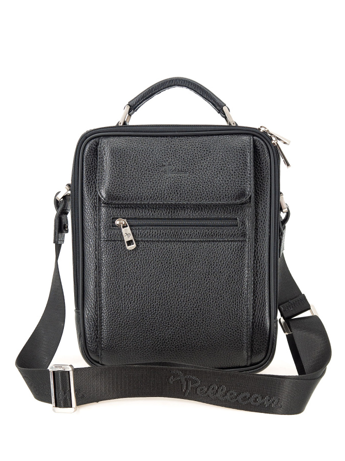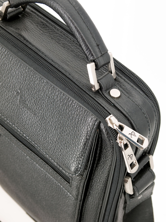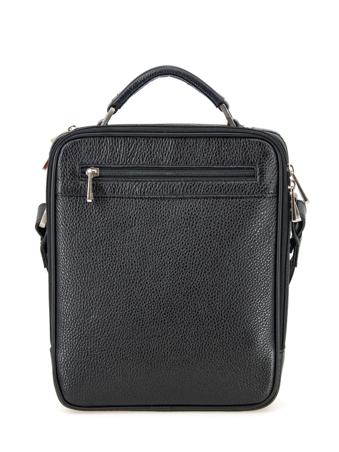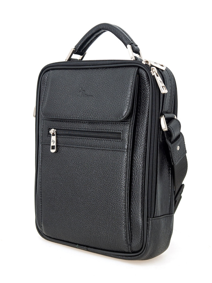 Натуральная кожа. Цвет черный. Размер (ШхВхГ): 23х28,5х8 см. Снаружи, на передней стенке: большой карман под створкой и карман на «молнии», на задней стенке: карман на «молнии». Два основных отделения (закрываются на «молнии»). Внутри: карман для мобильного телефона, две «петли» для авторучек, карман на «молнии». Изделие снабжено плечевым ремнём.